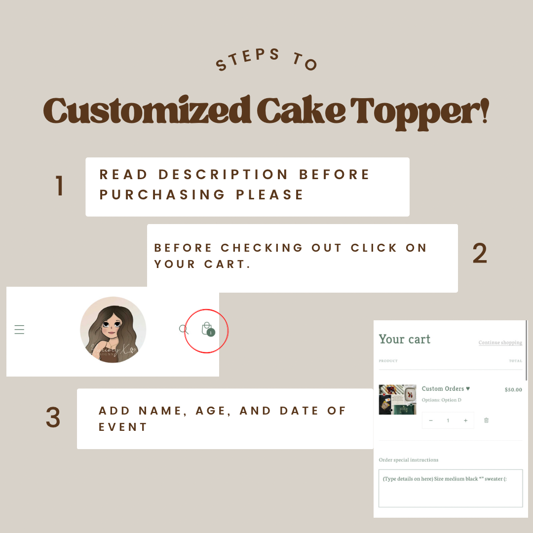You can find the special instructions box below. In this, let me know the name and date you need it by and color if you wanted a different color.